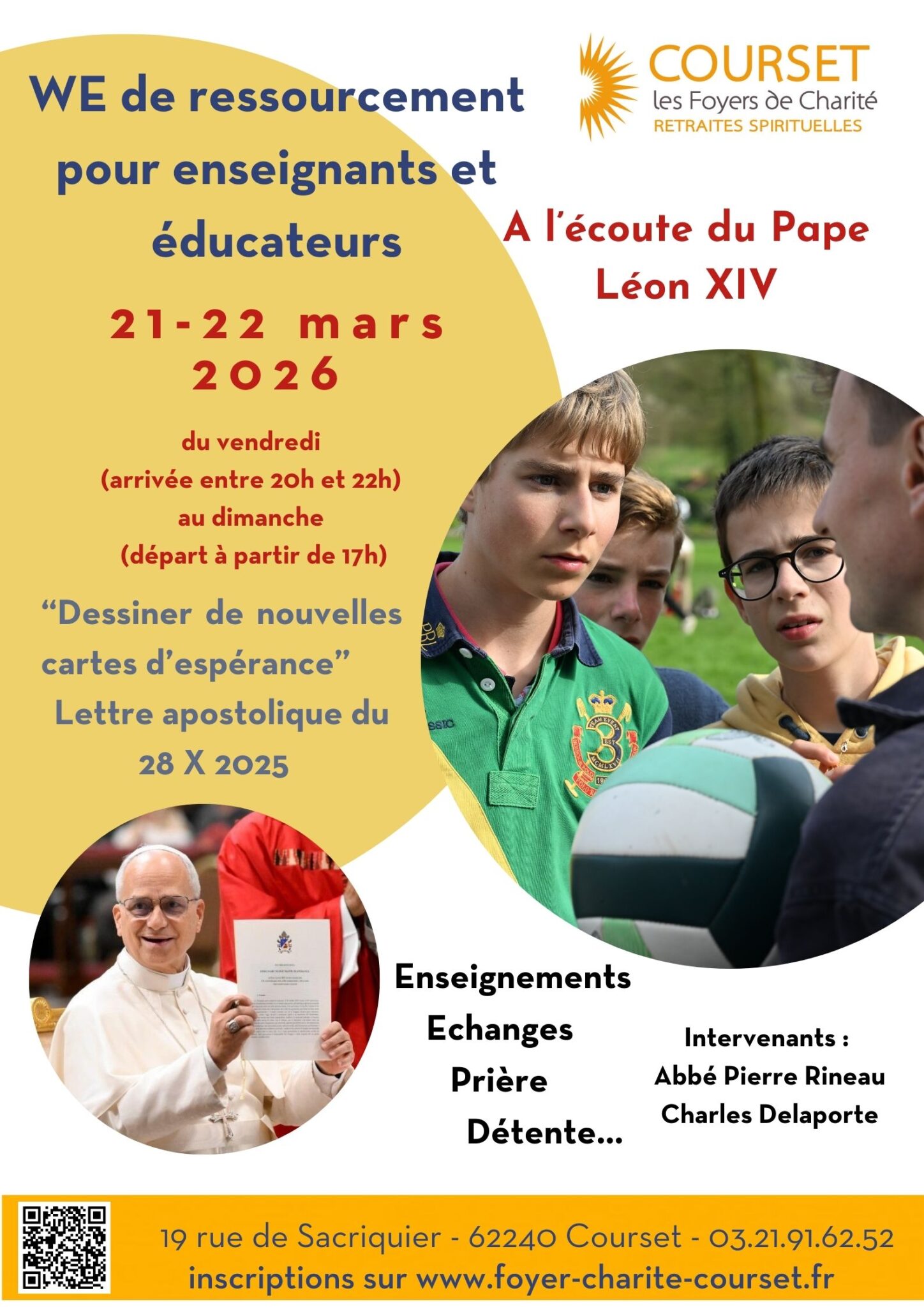 Au cours de ces quelques heures que nous souhaitons reposantes et ressourçantes pour chacun de vous, nous vous proposons de mieux découvrir l’enseignement de l’Église sur l’éducation et d’échanger sur nos pratiques, de souffler et nous reposer…